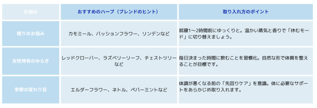 睡眠や婦人科系など、あなたの具体的な悩みに寄り添うブレンドティーが必ず見つかります。